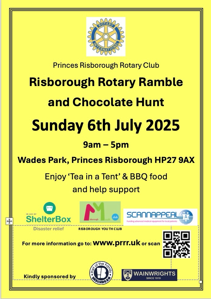 On 7th June the Club is running a Summer Lunch for those over 75 in the area who live alone. Also in June, on the 21st, we will be manning a stall at the Town’s Farmers’ Market, in the King George VOn On the 7th June the Club is running a Summer Lunch for those over 75 in the area who live alone. Also in June, on the 21st, we will be manning a stall at the Town’s Farmers’ Market, in the King George V field, during which we will be highlighting the work of “Blood Bikes” and offering the chance to win a magnificent Hamper. One of our major events this year is our Risborough Rotary Ramble on 6th July at Wades Park (9 am-5 pm). It offers a 6 or 12 mile walk for a charitable donation of £10 and a 3 mile family walk in aid of Scannappeal and the Risborough Youth Club (who will be doing a BBQ), a Chocolate Hunt, and “Tea in the Park” in aid of Shelterbox (a charity that delivers aid to families devastated by conflict or disaster, providing durable shelter and the tools to rebuild communities). We are a friendly, fun Club which also works hard for the local community. If you know of causes that would benefit from our support, or would like to donate to our Charity, please use the contact details below. Also, if you might consider joining us, visit our website and come to one of our Monday evening meetings at the Whiteleaf Golf Club to see if it might interest you. You can contact us at: rcpr.org.uk or call David White on 07787 750889, or email: